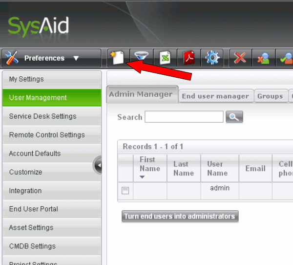 If you click on "create new user" icon at the top of the page you can create a new user in SysAid (Please note that this step is for demonstration. We create a new user in our example to demonstrate its process) (Figure 6).