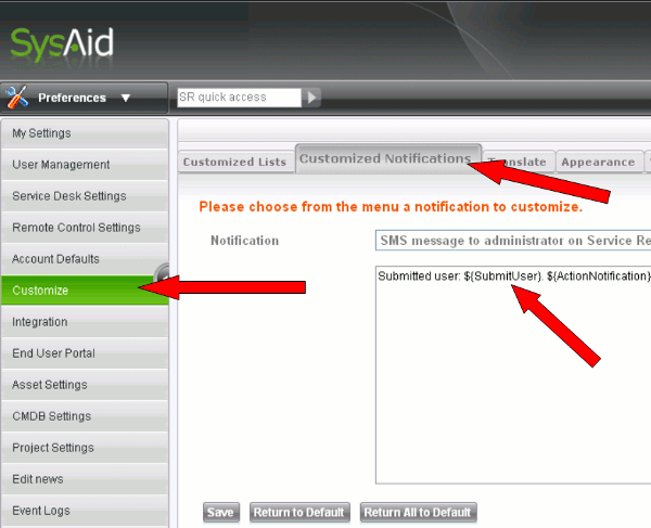 With Ozeki's solution you can send SMS from SysAid as notifications,