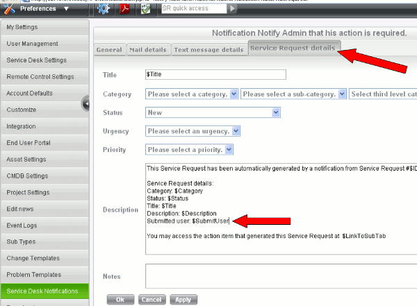Now select "Service Request Details" tab in "Service Desk Notifications" menu item. Here you can add custom values to be sent. In "Description" field you can type for example: