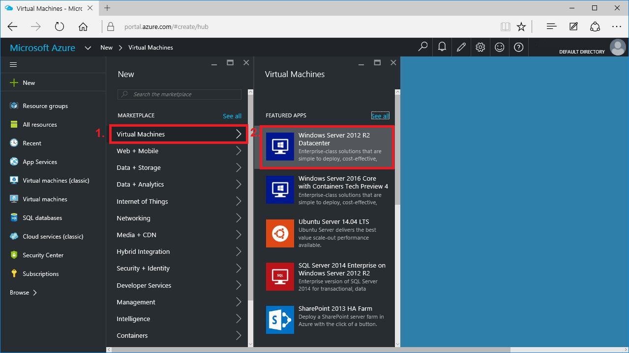 On the Hub menu, click New > Virtual Machines > Windows Server 2012 R2 Datacenter (Figure 3).