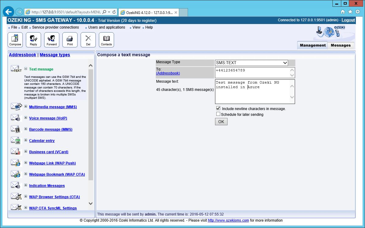In this azure sms gateway guide you will get detailed instructions on how to send SMS messages with the help of Ozeki NG SMS Gateway from your virtual machine created in Microsoft Azure. Please follow the instructions and check video tutorials and configuration screenshots, as well.